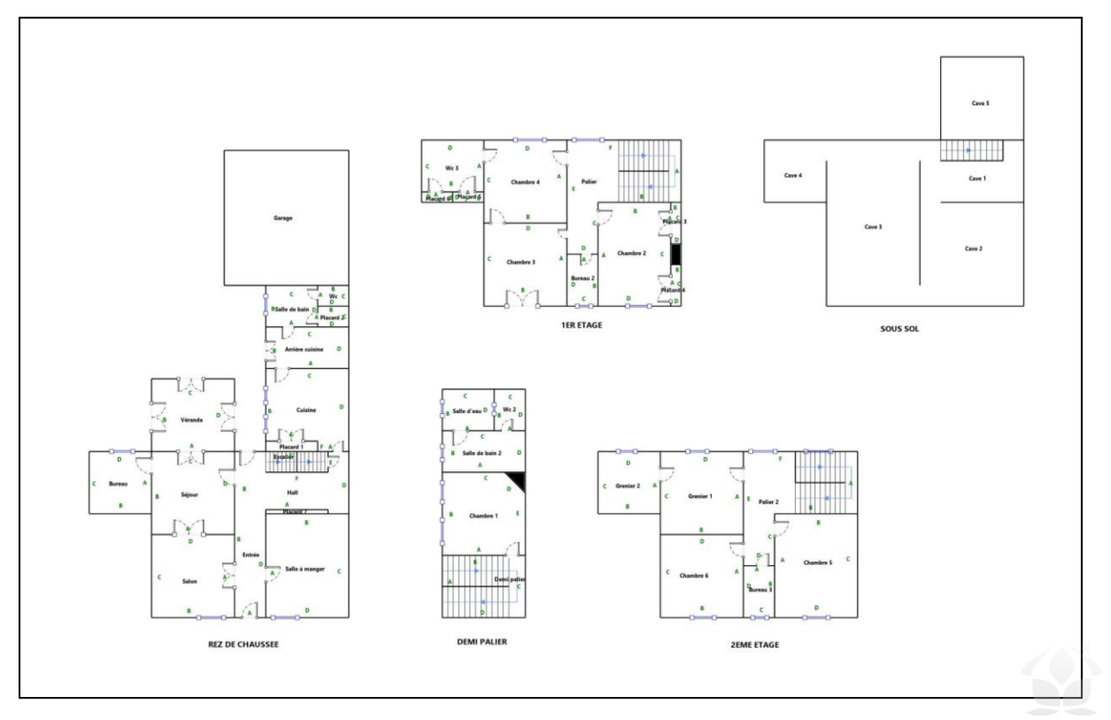 2ème étage : palier, 2 chambres, bureau, grenier.